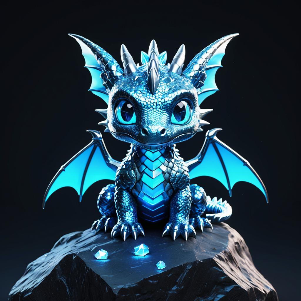 Shiny metallic blue baby dragon with tiny wings perched on a glowing neon crystal atop a dark rock, Studio Ghibli-inspired kawaii style, PBR 3D vector rendering, oversized sparkling eyes, simplified shapes, pure white seamless background, Adobe Illustrator tracing effect, SVG output, no shadows, no text, no splash background.