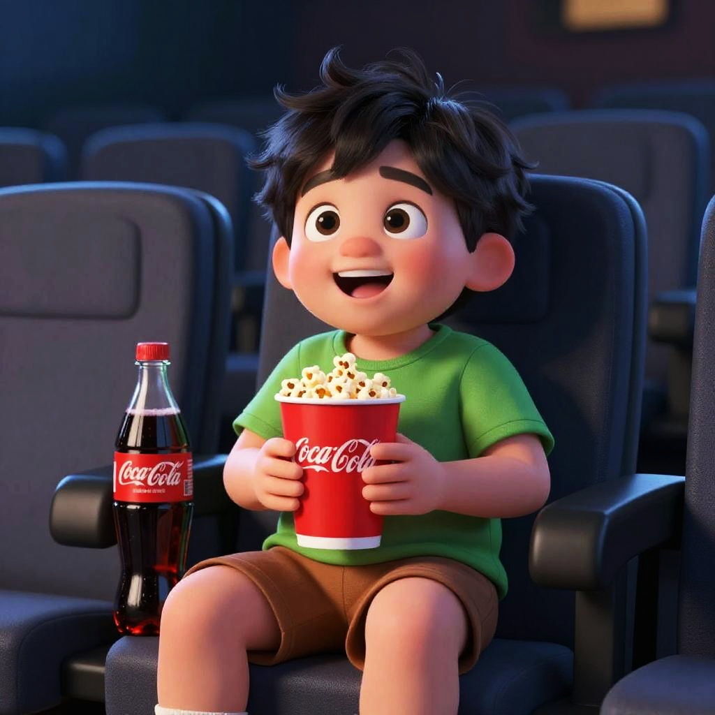 A cute CGI image of a chubby, wide-eyed boy with messy black hair, sitting in a dark movie theater. He's wearing a green shirt and brown shorts, holding a red Coca-Cola cup with popcorn spilling out. A large Coke bottle sits next to him on the seat. The background is blurred with dim lights and other theater seats. He looks excited, smiling big with his mouth open.
