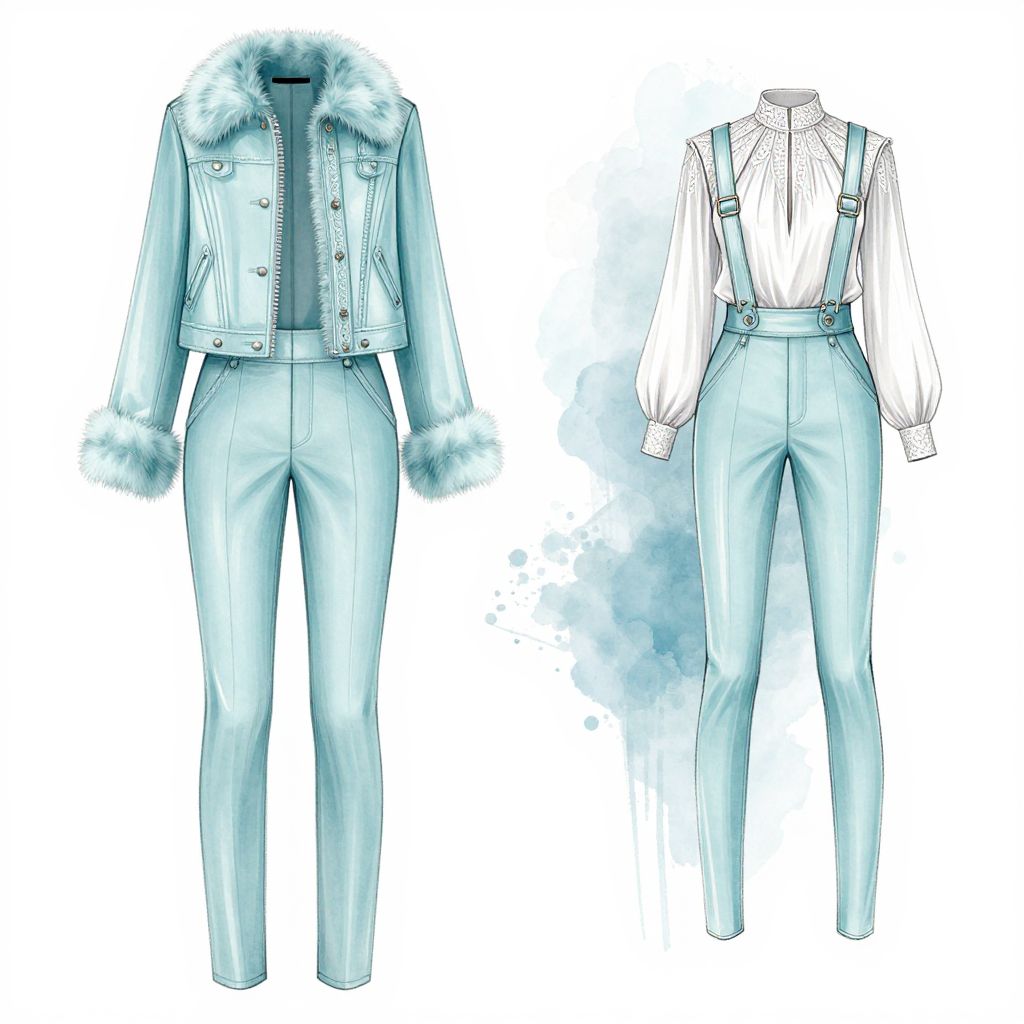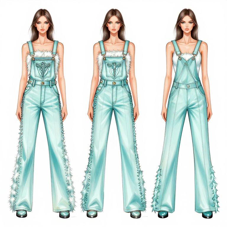 Fashion illustration sketches of soft cyan Just Cavalli overalls featuring fur accents and intricate detailing.