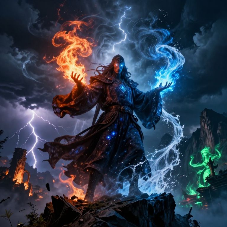 Neurochaos, A lone mage stands at the eye of a cataclysmic storm, their cloak shredded and ablaze, whipped by violent winds, Their staff radiates volatile energy, glowing with bursts of neon lightning that spiral into the churning void, Molten fire erupts from their outstretched hand, colliding with storm clouds in deafening explosions, sending arcs of blinding plasma outward, Fragments of their form dissolve into embers, swirling in the chaos as the ground cracks beneath them, glowing with seeping lava, The mage remains unyielding, a silhouette of defiance, commanding a maelstrom that tears reality apart with every pulse