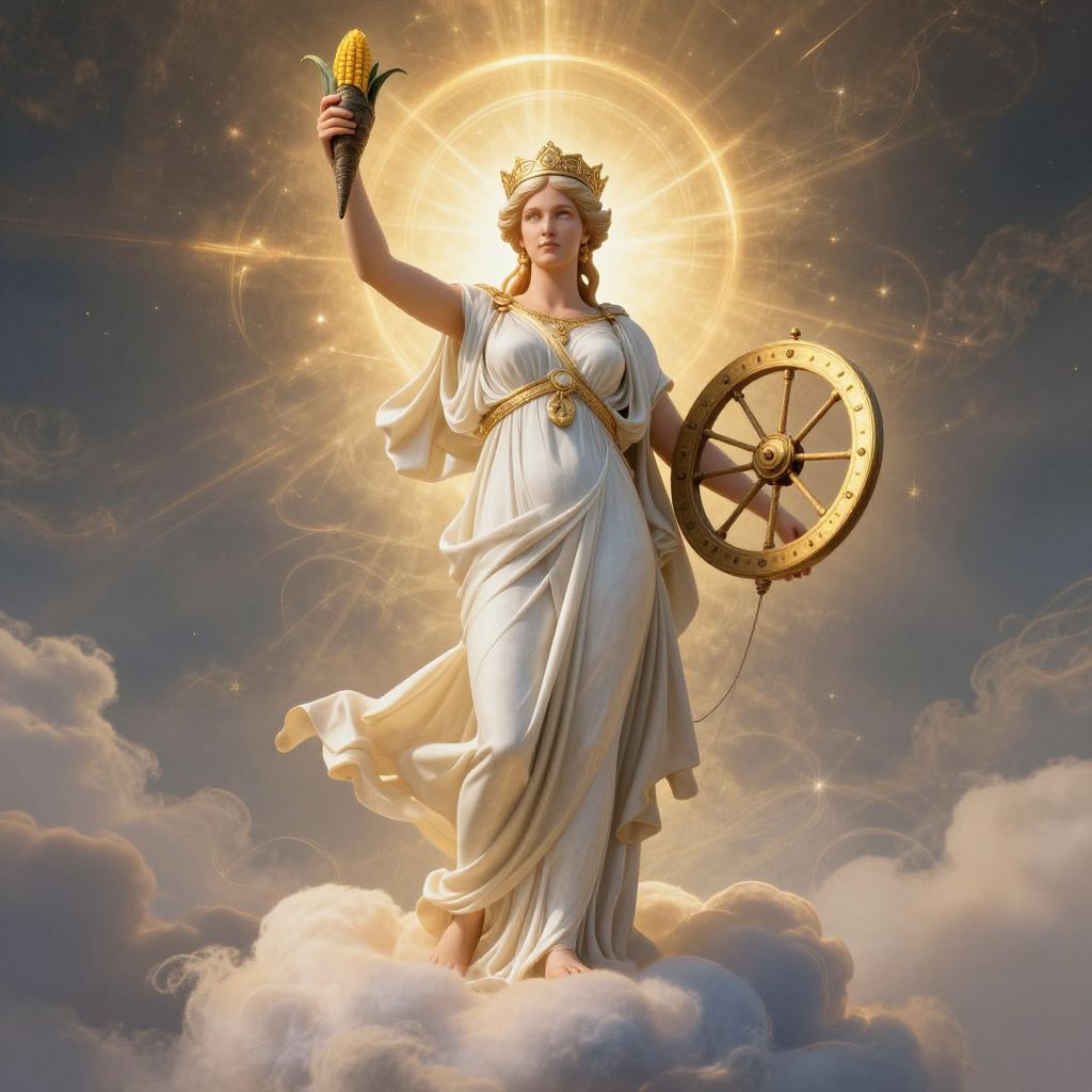 Tyche, the ancient Greek goddess of fortune and luck, depicted as a majestic woman in flowing robes, holding a cornucopia and a wheel of fortune, standing atop a cloud, with a radiant golden aura, ethereal and mystical atmosphere, classical mythology style.
