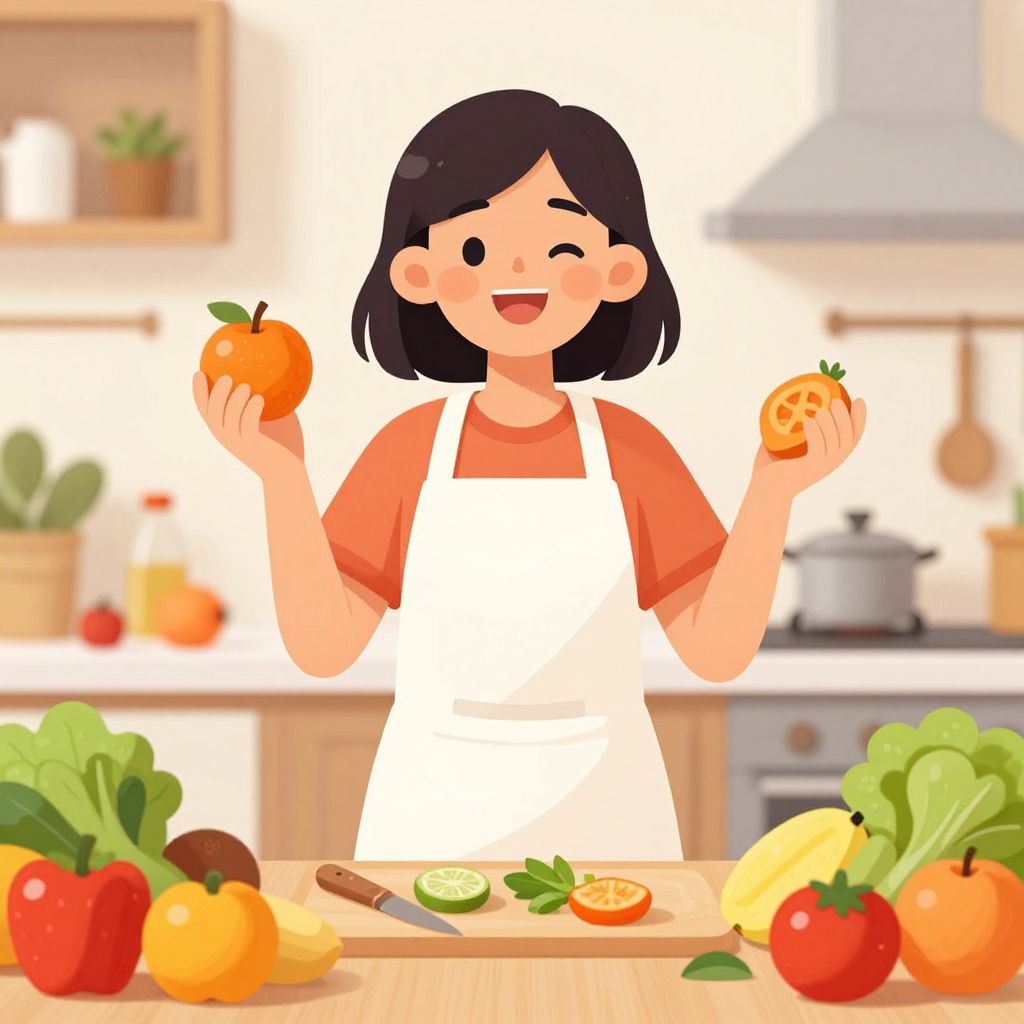 A vibrant cartoon-style illustration depicts a cheerful woman in an apron standing in a kitchen, surrounded by fresh fruits and vegetables, emphasizing the importance of a healthy diet in preventing Type 2 diabetes, rendered in bright, clean digital art with a focus on colorful, detailed food items and a cozy, homey atmosphere.