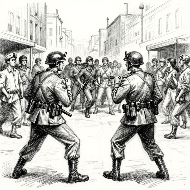 Coup d'etat drawing, dramatic confrontation between soldiers and civilians in a tense city square, bold lines, contrasting shadows, expressive and raw pencil sketch
