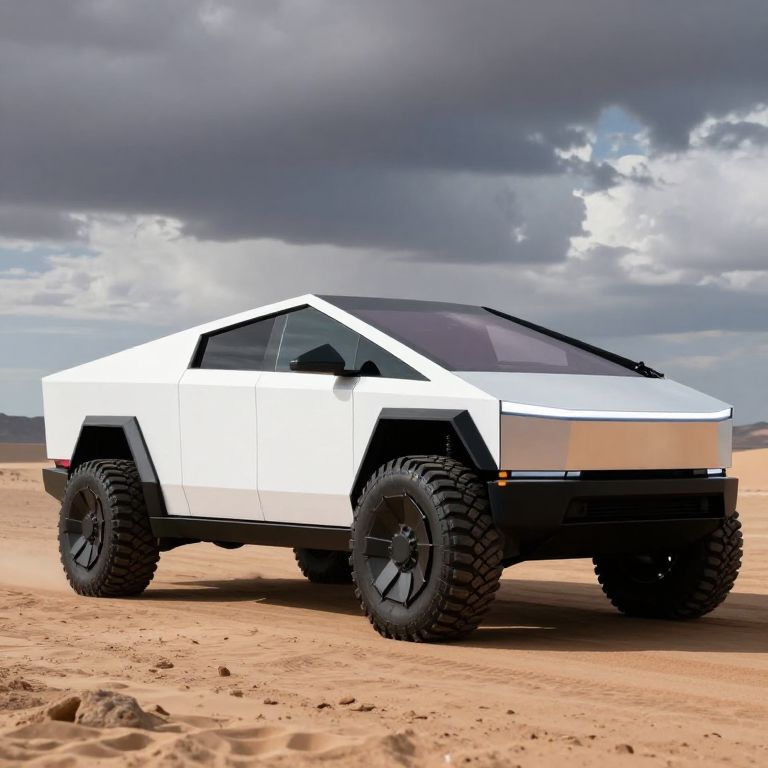 A futuristic white cybertruck concept vehicle with large treads and a sleek design, set against a desert landscape with a dramatic sky.
