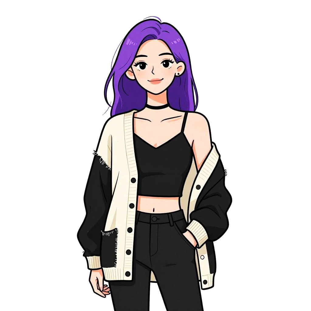 This digital drawing in a bold, anime-inspired style features a young woman with long, vibrant purple hair and fair skin. She wears a black choker, a black crop top with thin straps, and high-waisted black pants. Over her top, she has a white and black cardigan with buttons, slightly off her shoulders, exposing her midriff. Her left hand is casually in her pocket, and she has a subtle, confident smile with small, black eyes. The background is plain white, making her the focal point. The drawing uses thick black outlines and flat, bright colors, giving it a modern, graphic feel.
