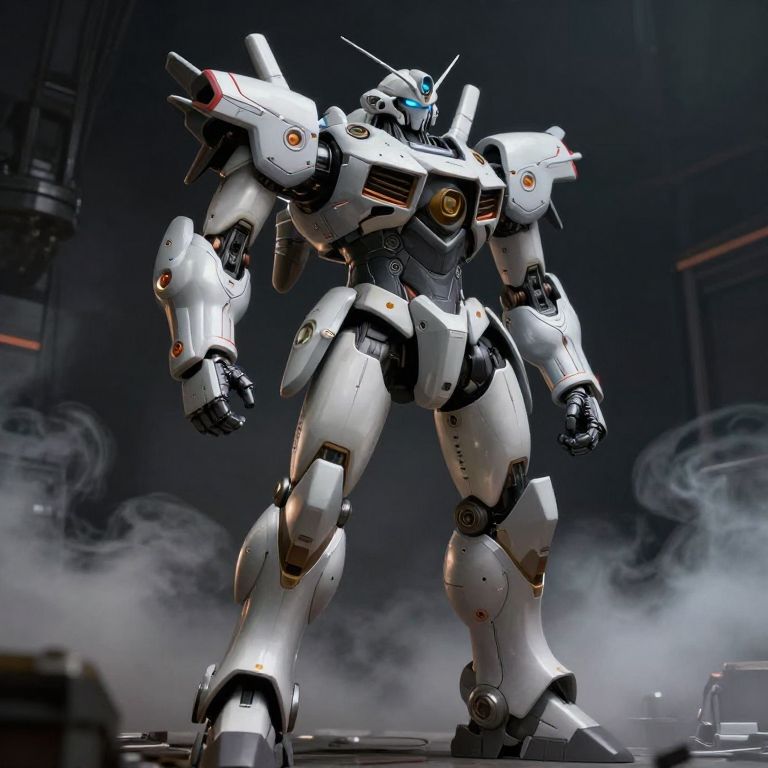 Photorealistic digital CGI image of a large, white, humanoid mecha robot standing in a dark, industrial setting. The mecha has a sleek, angular design with black and gold accents, and red-tipped fins on its shoulders. Its chest has a glowing, circular yellow light. The robot's eyes are blue and it has a small antenna on its head. Smoke or mist swirls around its legs, adding a dramatic effect. The background is blurred, featuring dark metallic structures and red lights. The mecha's surface is shiny and detailed, showing intricate mechanical joints and panels.