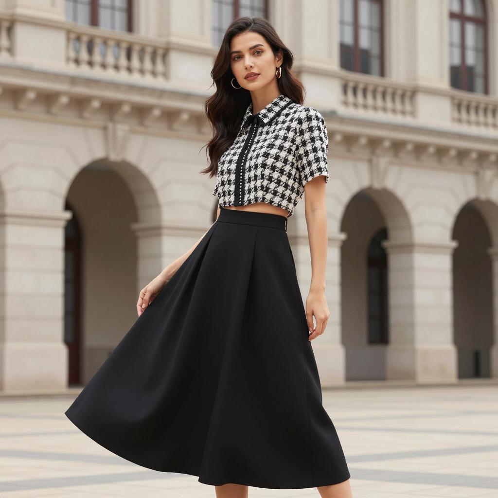 A woman dons a chic ensemble featuring a voluminous skirt, paired with a stylish cropped blouse, as she poses elegantly against the backdrop of classical architecture.