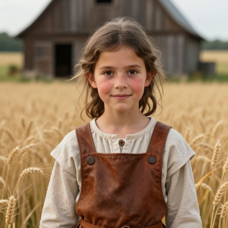 A realistic scene of a young medieval farmer girl with a medium, tousled hairstyle, wearing simple farmer’s attire with a leather apron and woolen dress, standing in a rustic field during harvest season with golden wheat and a wooden barn in the background, her face has a lively, innocent expression with dark brown eyes and sun-kissed cheeks, the setting is natural and grounded with soft morning light.