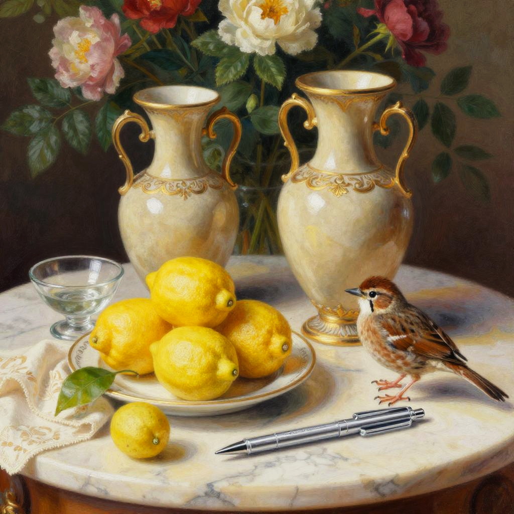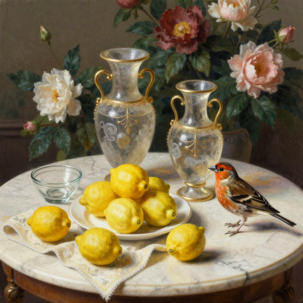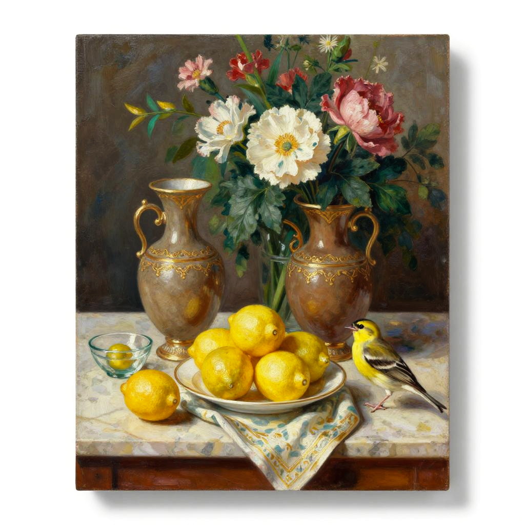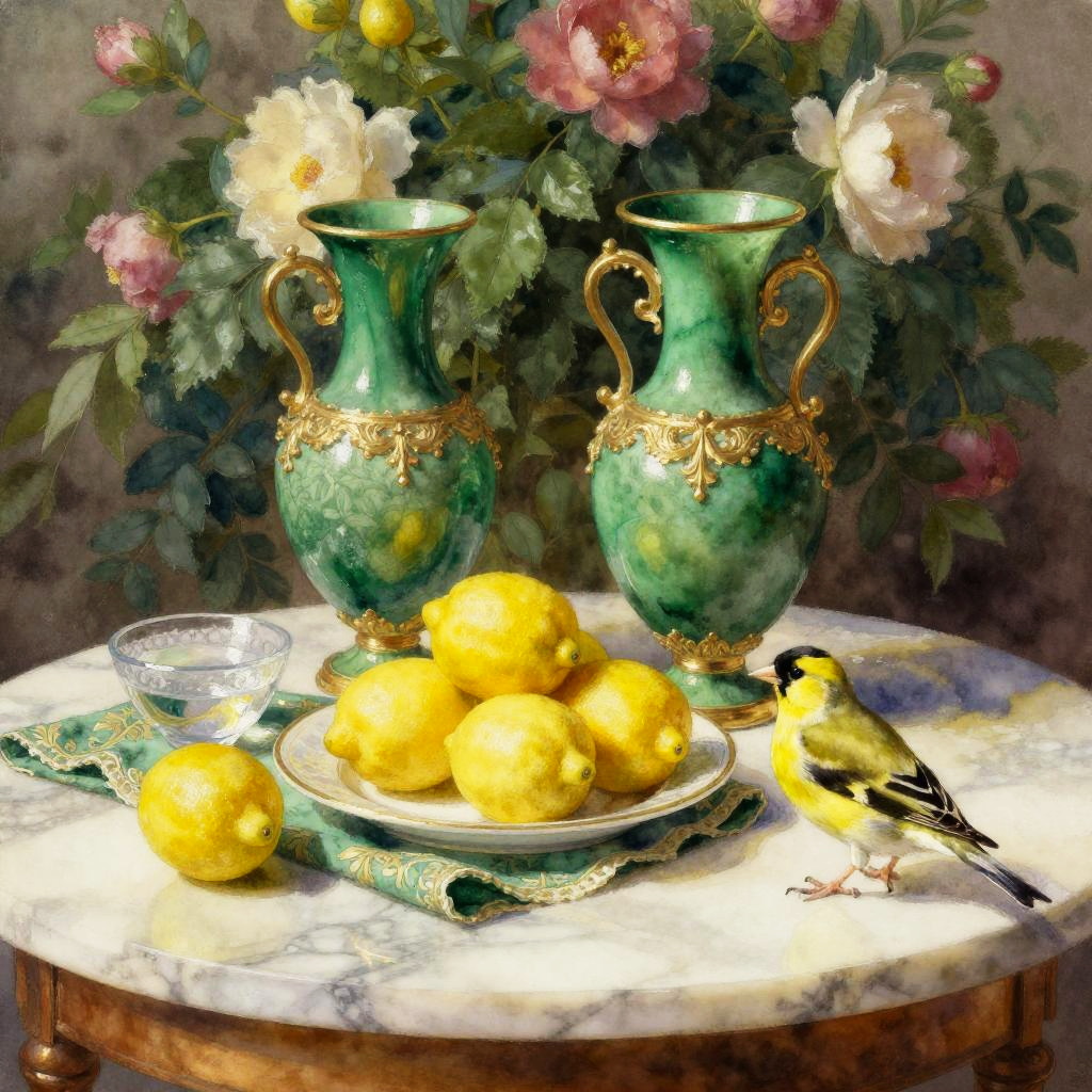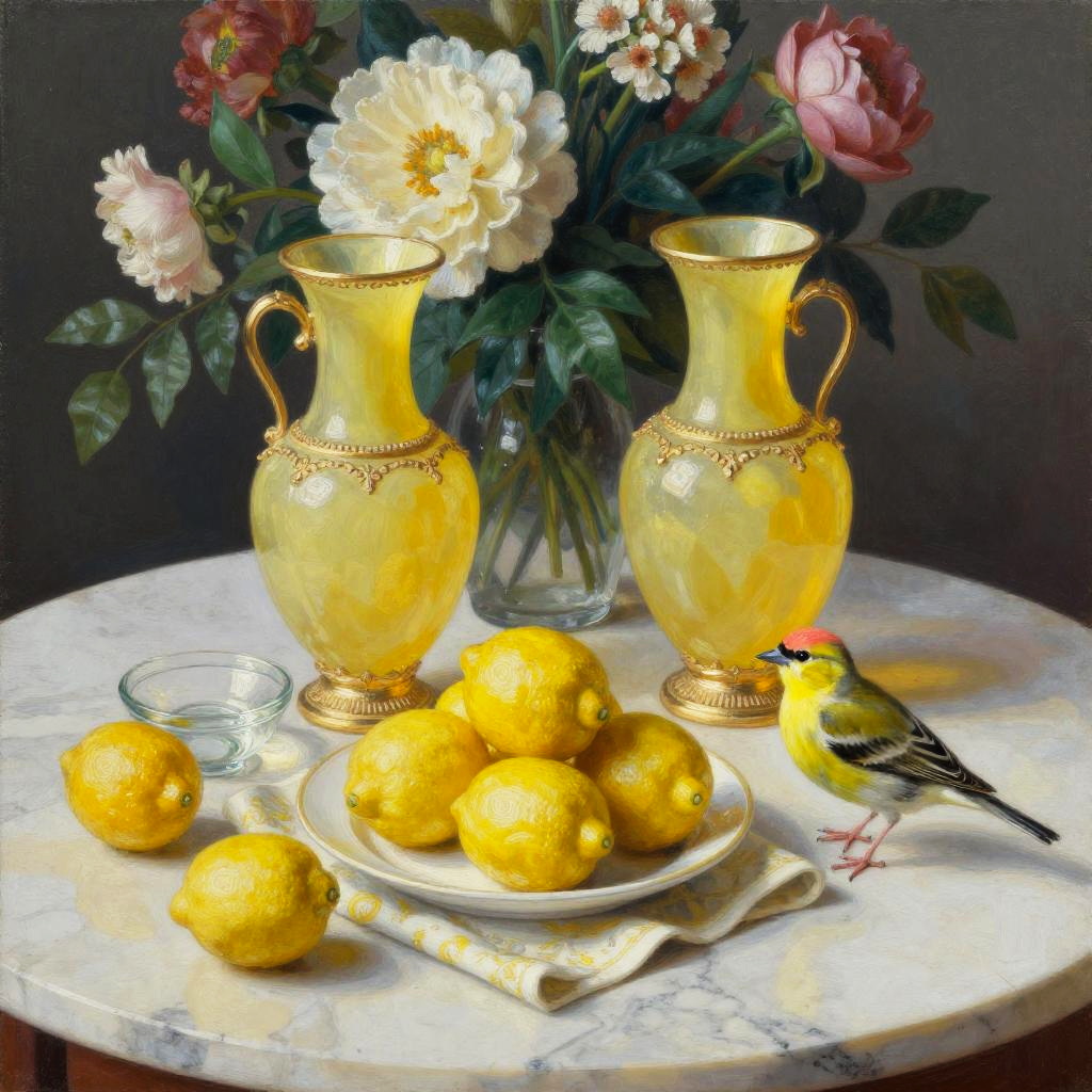 Tempera on panel still life on a marble tabletop: two ornate, peat brown vases with delicate gold accents stand before a lush floral backdrop. In front, a white plate overflows with bright lemons on coordinating cloth; a few scattered fruits and a small glass bowl add rhythm. A yellow warbler with light brown markings rests near the edge, calm and attentive. Soft directional light, realistic textures, subtle reflections, balanced composition, gentle shadows, rich color harmony, museum ambiance, high detail, painterly finesse.