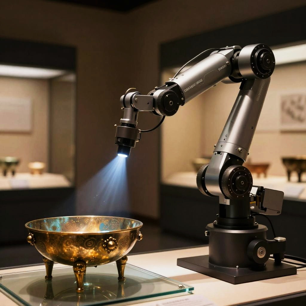 A scancar robot performing detailed 3D scans of ancient artifacts in a dimly-lit museum, intricate mechanical arms with scanning beams emitting soft light, high detail textures on metals and glass surfaces, warm ambient shadows, photorealistic style.