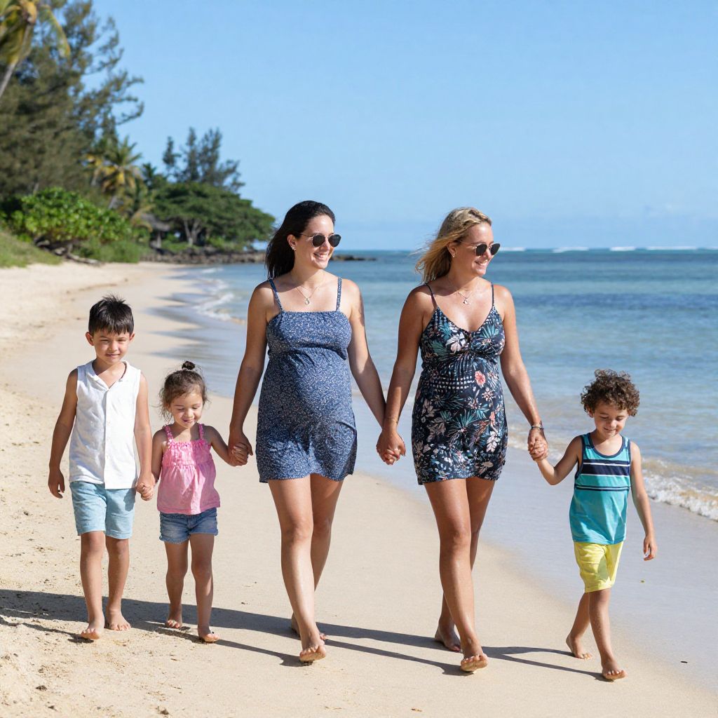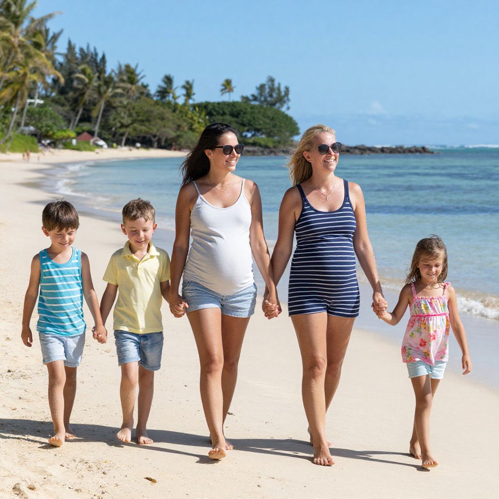 Four individuals—a pregnant woman, another woman, and two children—walk hand-in-hand along a sandy beach, smiling joyfully as they enjoy a sunny day by the ocean, showcasing the vibrant and family-friendly atmosphere of Fiji.