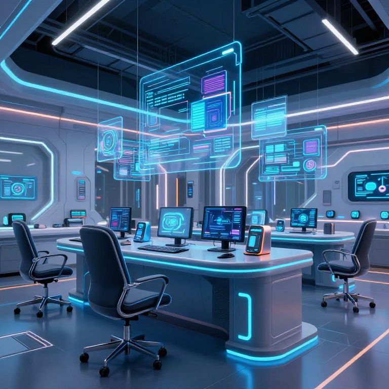 Interior of a futuristic sci-fi workspace, neon lighting, transparent digital screens floating in mid-air, ergonomic curved chairs, metallic surfaces with blue LED strips, high-tech gadgets arranged neatly, ultra-detailed cyberpunk-inspired environment
