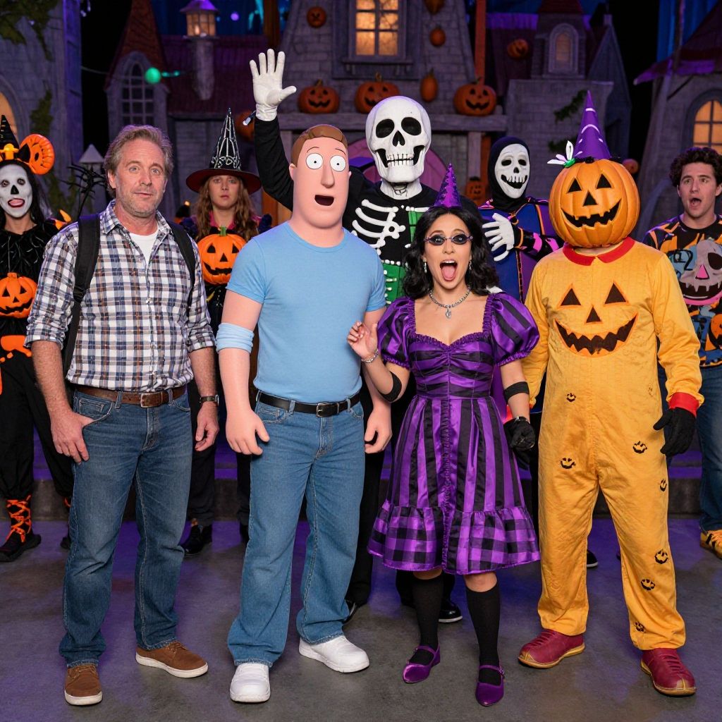 Group photo at a Halloween costume contest, highlighting the duo in Peter and Lois Griffin Halloween costumes, detailed clothing and props mimicking Family Guy characters, colorful and playful setting with haunted house decorations and spooky lights, fun and energetic vibe
