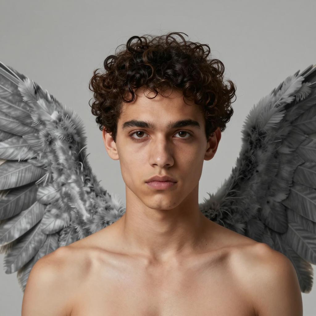 Photograph of a dark-skinned, young man with curly black hair, shirtless, facing the camera, serious expression. Background: dry, red desert with sparse grass. Sunlight highlights his skin. Right side: tall, dry grass. Man centered, upper body.