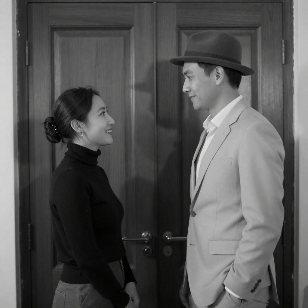 Black-and-white photograph of two people. Woman with dark hair in a bun, wearing a black turtleneck, smiling at a man. Man in a light-colored suit with a hat, standing in front of dark wooden doors. Woman on left, man on right. Woman's shadow on door. Intimate, indoor setting.