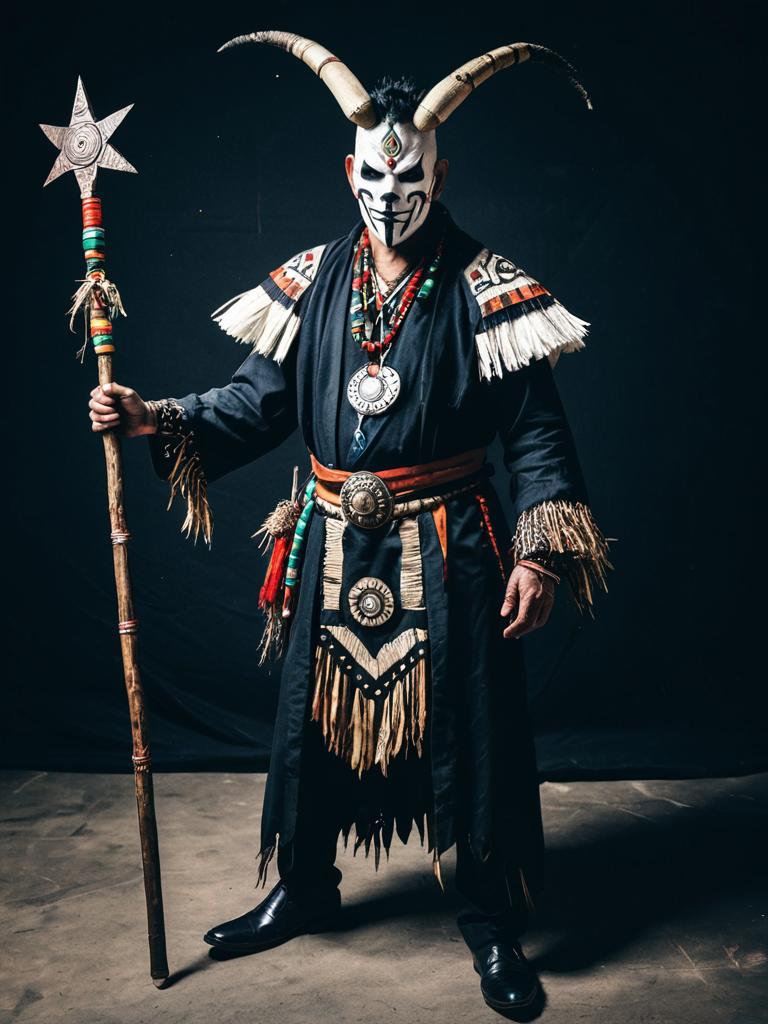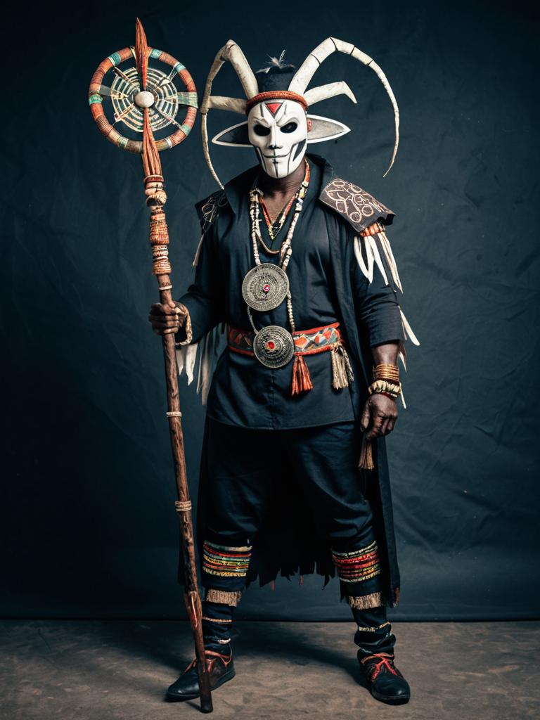 Man in Witch Doctor Costume, full-body cosplay photo with mask and staff