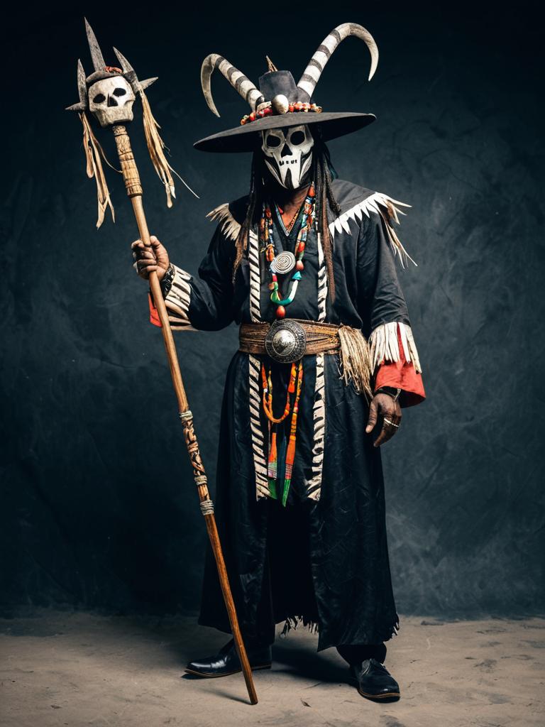 Man in Witch Doctor Costume with Staffs