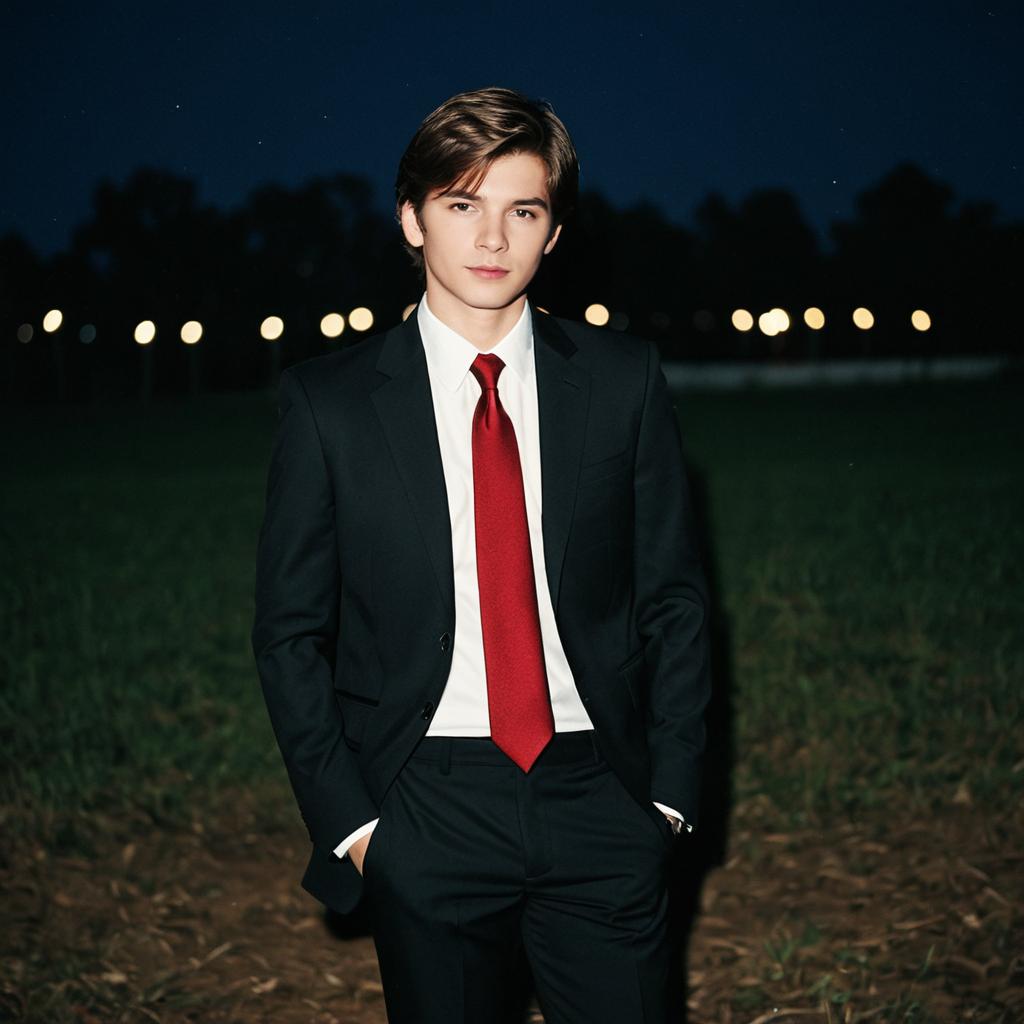 Evening trouser suits,1boy, male focus, necktie, solo, red necktie, suit, shirt, white shirt, formal, jacket, collared shirt, pants, realistic, looking at viewer, brown hair, closed mouth, standing, night, black pants, long sleeves, outdoors, black jacket, blurry background, blurry