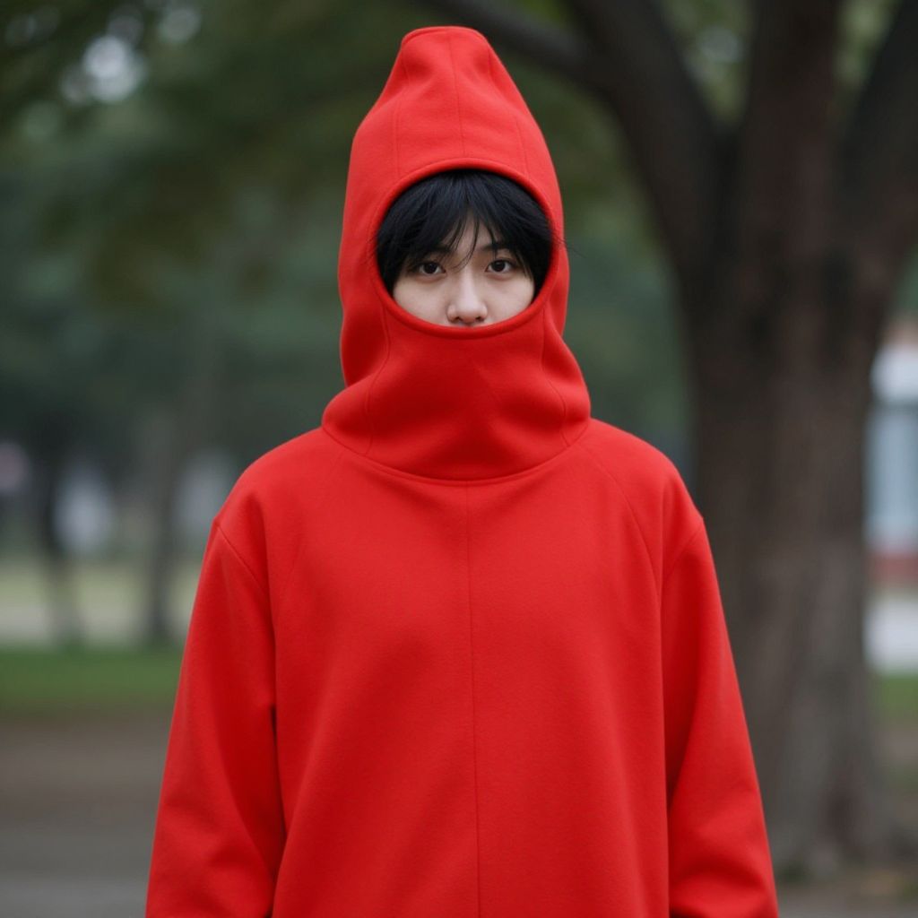 Photograph of an Asian person with pale skin and black hair, wearing a bright red hooded sweatshirt with the hood up, covering their mouth and nose. Only their eyes are visible. The background is a blurred outdoor park setting with green trees and a hint of a white building. The person's expression is neutral, and the vivid red of the sweatshirt contrasts sharply with the muted greens and browns of the background, drawing attention to the subject. The texture of the sweatshirt appears soft and slightly worn.