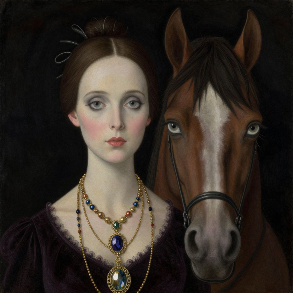 A surrealist digital artwork featuring a woman adorned in ornate jewelry and a horse-like creature with striking eyes, evoking the dreamlike and fantastical style reminiscent of Leonora Carrington's surrealist paintings.
