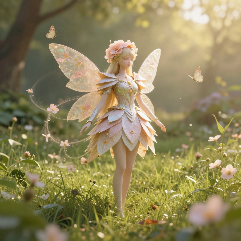 An elegant vivisteria flower elemental in a fantasy meadow, delicate petals forming armor around its figure, gentle blossoms swirling in the air, illuminated by warm golden hour sun rays filtering through lush greenery and fluttering butterflies.