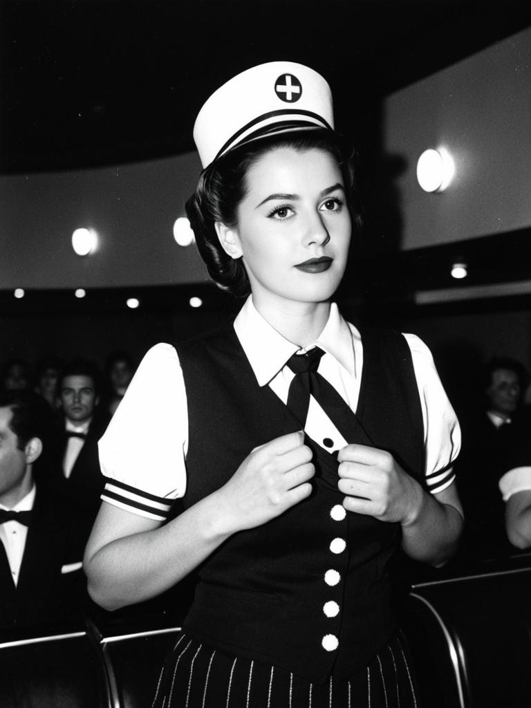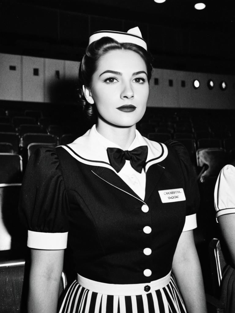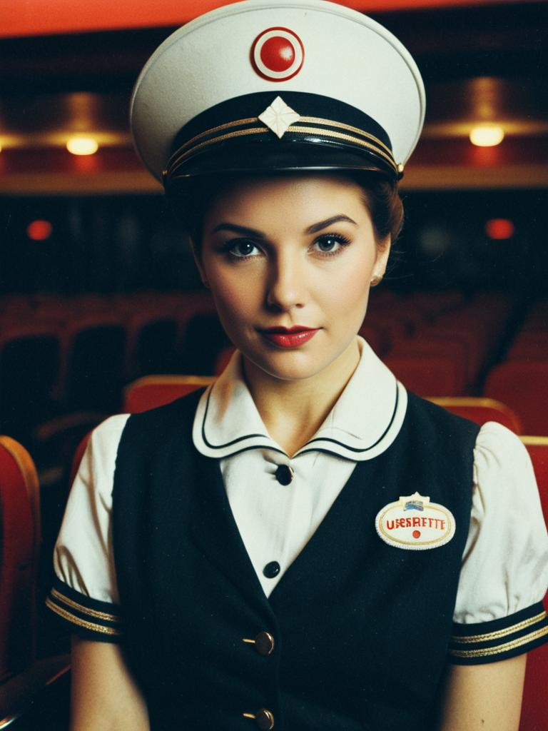 Woman in Cinema Usherette Costume, waist-up editorial portrait, photorealistic tones