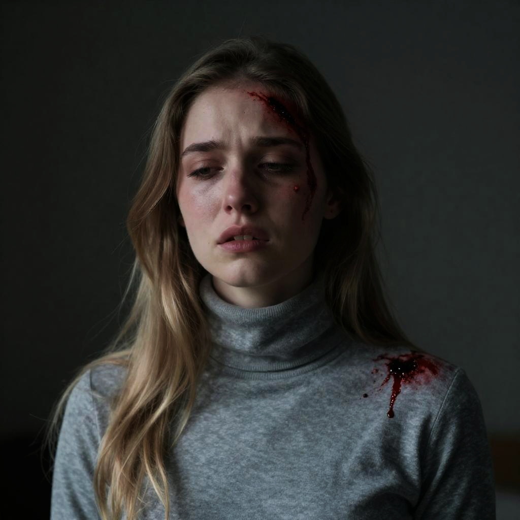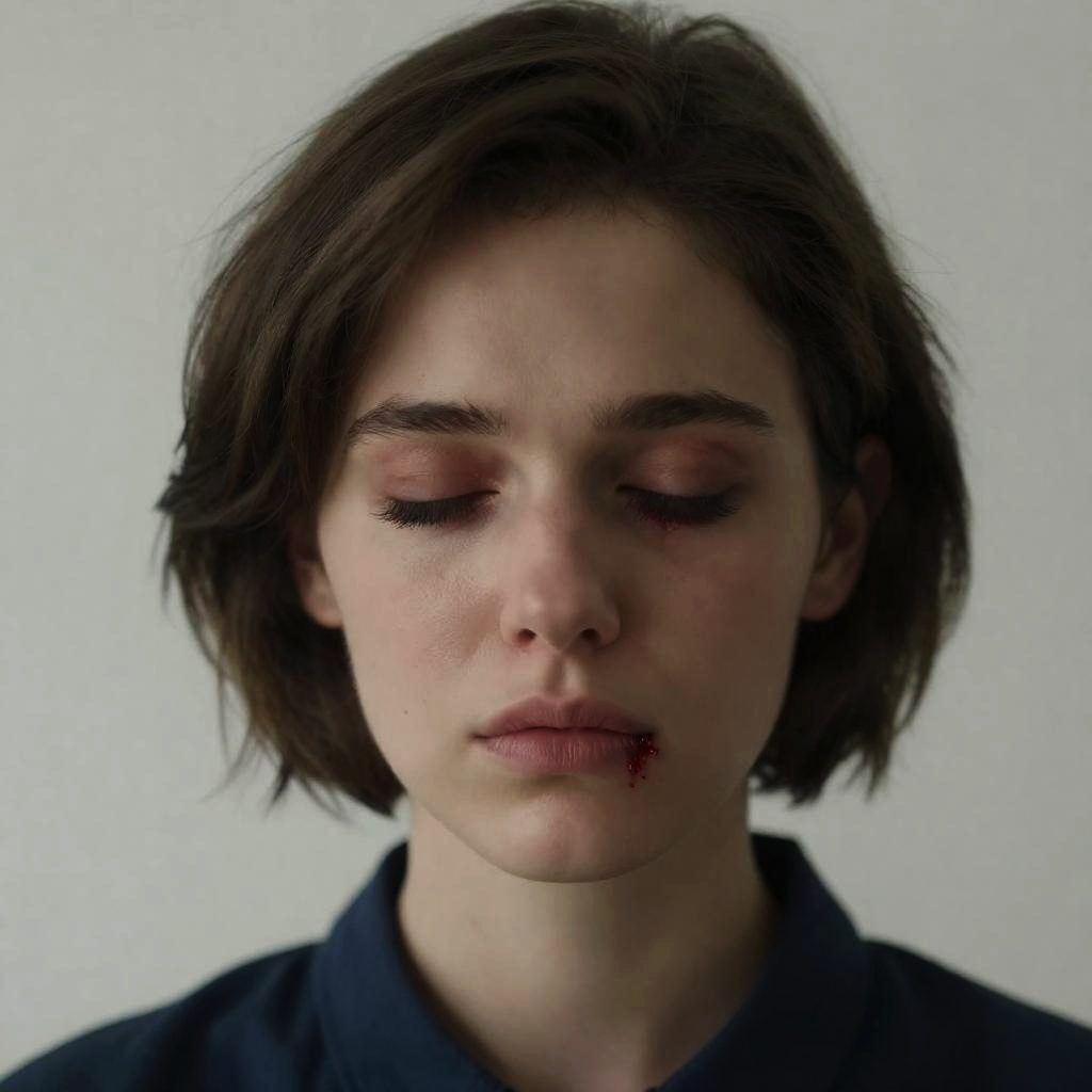Close-up photograph of a young woman with short, tousled brown hair, closed eyes, and slightly parted lips. She has a small bruise under her right eye and a blood smear on her lower lip. She wears a dark blue garment with a high collar. Background is a plain, light-colored wall. Her expression is somber and slightly distressed.