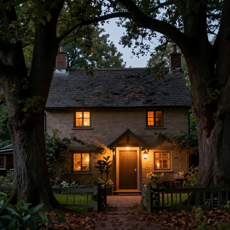 Enveloped by the embrace of ancient trees, the warmly lit cottage invites a sense of sanctuary and introspection, where the gentle rustle of leaves and the soft glow of candlelight whisper stories of solace and timeless connection.