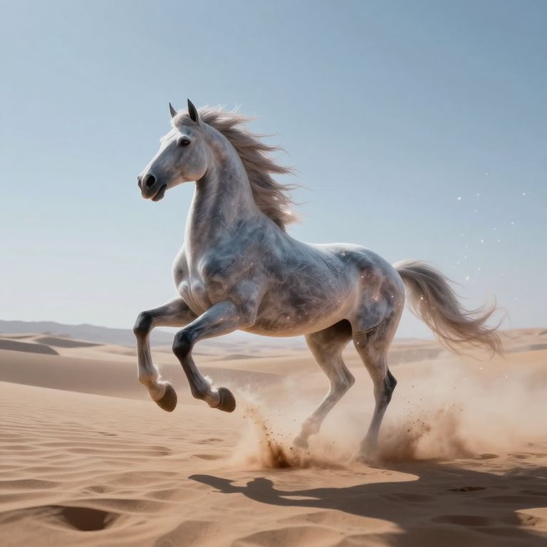 A spectral knight, cloaked in the ephemeral embrace of smoke and sparks, gallops across a mirrored desert, his steed dissolving and reforming with each thunderous hoofbeat, embodying the transient dance between existence and oblivion.