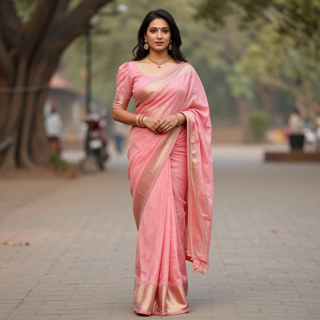 Photograph of a beautiful Indian woman in a pink saree with gold trim, standing confidently on a tree-lined street.