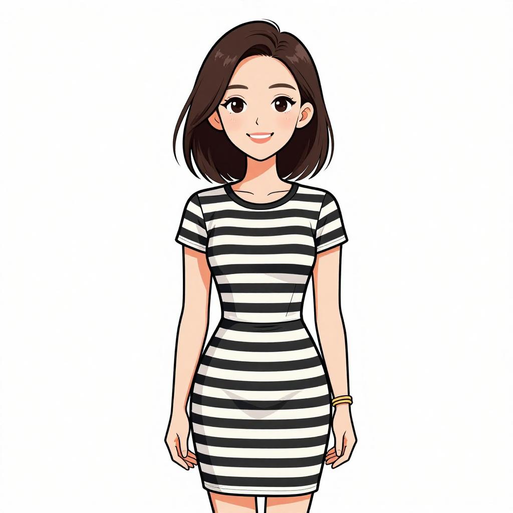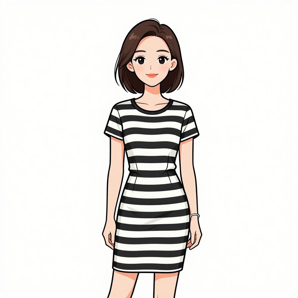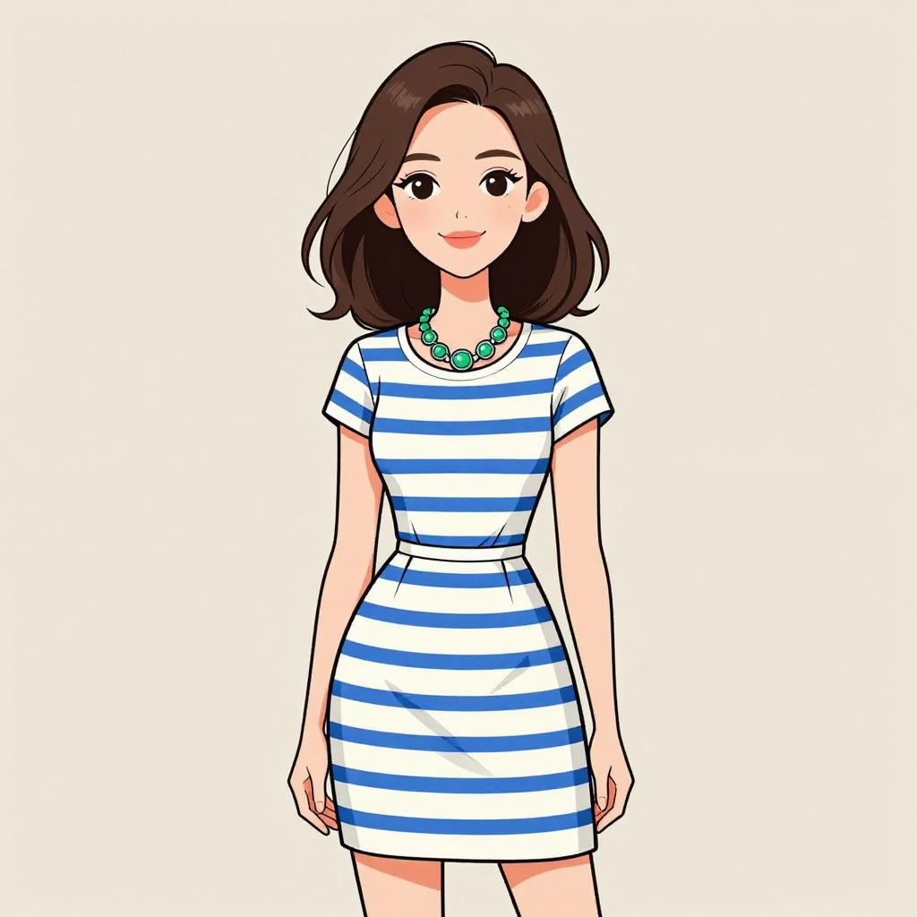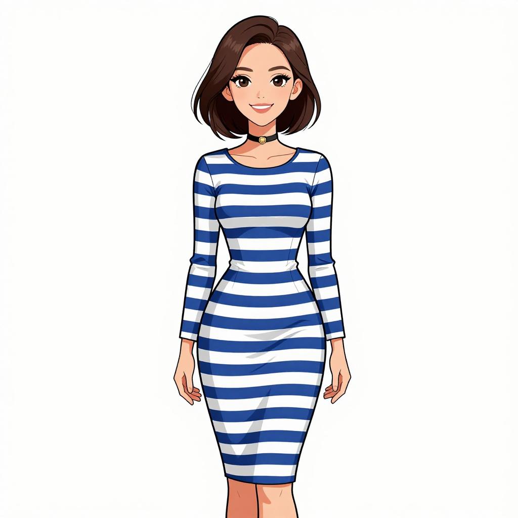 Woman with pretty face and pretty hair. smiling Woman, nautical-inspired, fitted midi dress in horizontal navy blue and white stripes, round neckline, long sleeves, slight flare at hem, black choker with small ornament, white studio background --sref 1467