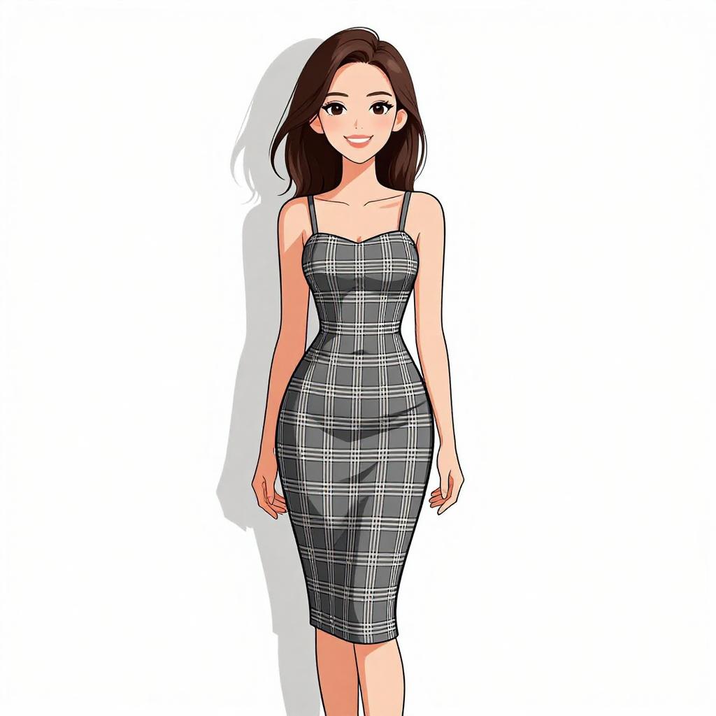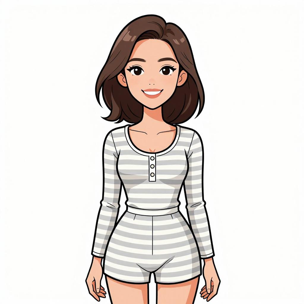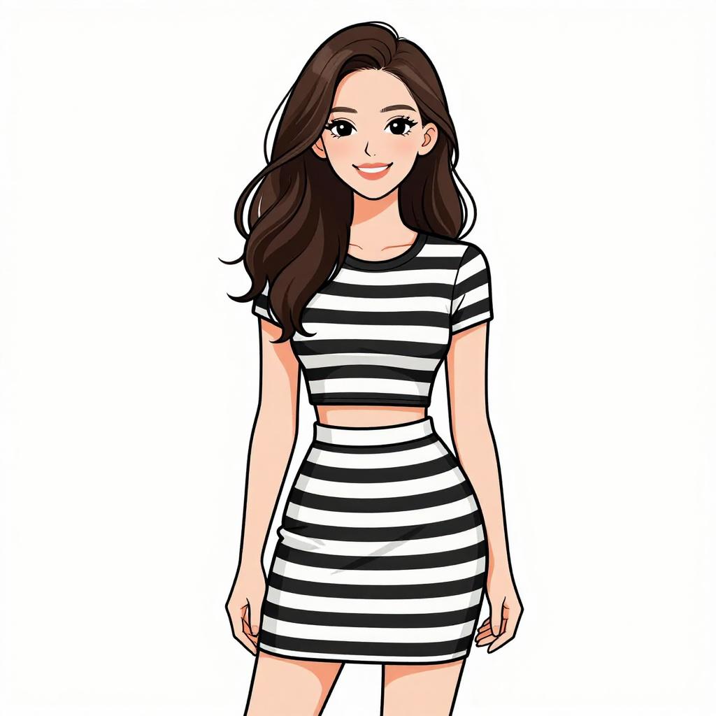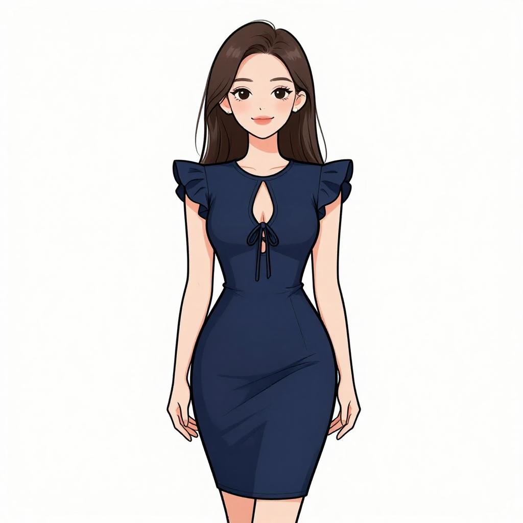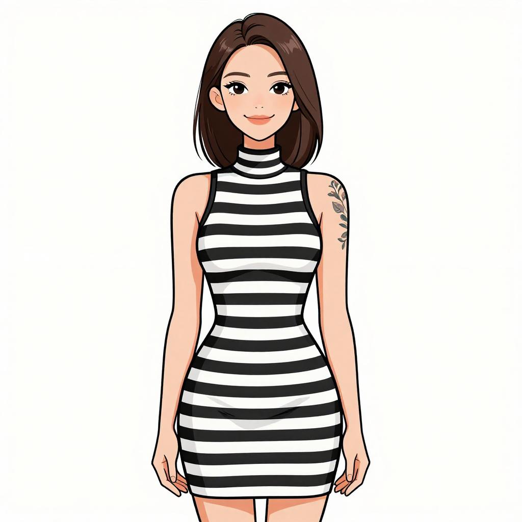 Woman with pretty face and pretty hair. smiling Woman, nautical-inspired, fitted midi dress in horizontal navy blue and white stripes, round neckline, long sleeves, slight flare at hem, black choker with small ornament, white studio background --sref 1467