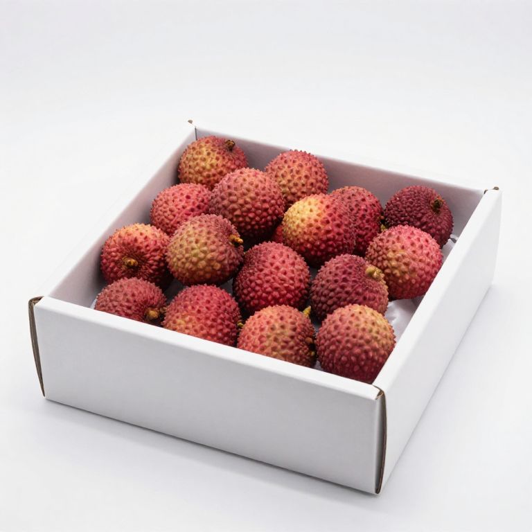 "Clouds high quality fresh fruit packaging, white background, box, satin, volumetric lighting, litchi,"