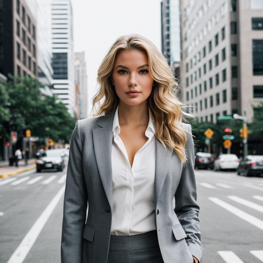 Business professional outfit, photorealistic portrait of a beautiful woman, blonde hair, long wavy, standing on a city street, wearing a gray suit with a white blouse, medium-sized breasts, slim physique, confident expression, natural light, urban background, buildings in the background, daytime, crisp colors, professional attire, realistic ure, high detail, modern fashion, business outfit, casual pose, full body shot