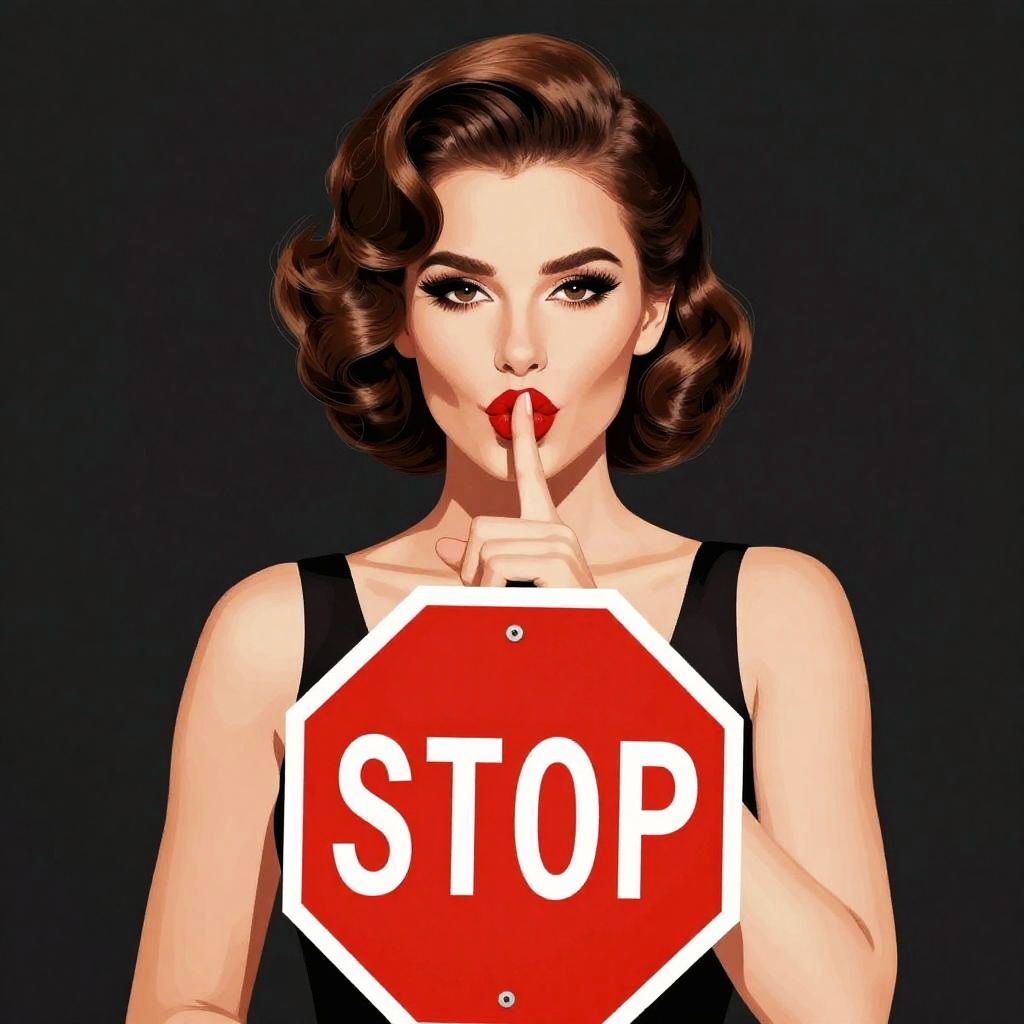 This striking illustration features a woman with glamorous vintage-style hair and makeup, signaling for silence with a playful yet authoritative expression. She holds a stop sign, creating a strong focal point against a smooth, dark background, emphasizing her captivating presence.