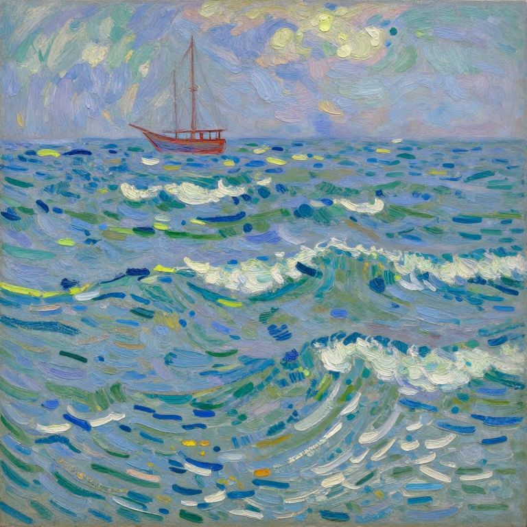 Beautiful rolling waves, with a distant, red sailed yacht in the style of monet and signac and painted in a style of painting similar to van gogh but more impasto and less hatching