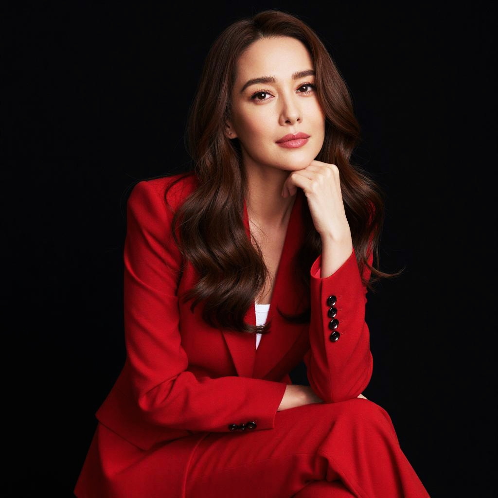 Editorial portrait of an graceful adult woman, medium skin tone, long straight chestnut hair, amber eyes in misty forest, wearing elegant plum velvet gown; direct gaze, relaxed expression, soft flattering light with gentle rim highlights, refined makeup, natural color grade, photoreal SDXL, high detail, tasteful, magazine-quality, shallow depth of field, subtle film grain, clean background, balanced composition.