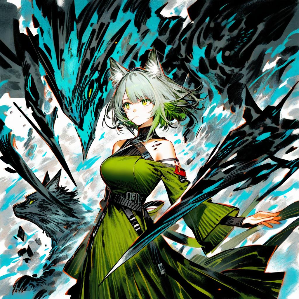 Mon3tr (arknights), arknights, 1girl, cat girl, monster, cat ears, animal ear fluff, green eyes, short hair, green hair, grey hair, white hair, green dress, bare shoulders, long sleeves, oripathy lesion (arknights), by artist kotteri, animagine