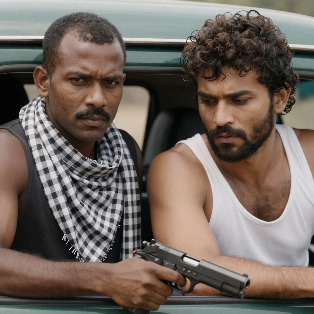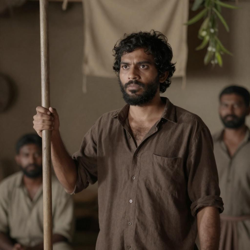 Photograph of a chaotic, brightly lit street party. Central bearded man with messy dark hair, dirty beige shirt, and khaki pants dances energetically. Surrounding him, a diverse crowd with raised arms, smiling, and cheering. Background filled with colorful lights and smoke. Man on left wears orange shirt with "MACKEREL" , dark hair, mask. Vibrant, festive atmosphere.
