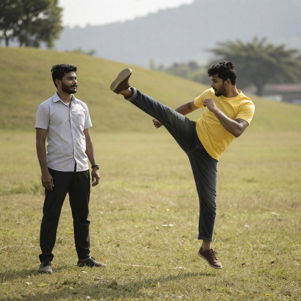 Bearded man with messy dark hair wearing a dirty beige shirt and khaki pants dances energetically at a vibrant street party. Around him, a diverse crowd of young adults, including a man in an orange 'MACKEREL' shirt and a face mask, cheer and raise their arms. The scene is lively with colorful lights and smoke in the background, creating a festive atmosphere.