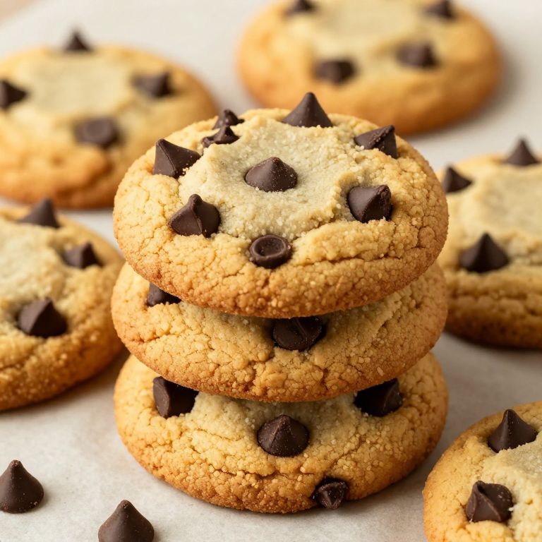 Golden-brown chewy gluten-free cookies, generously studded with rich dark chocolate chips, are artfully stacked and scattered on a rustic parchment paper background, showcasing their soft, crumbly texture and inviting appearance.
