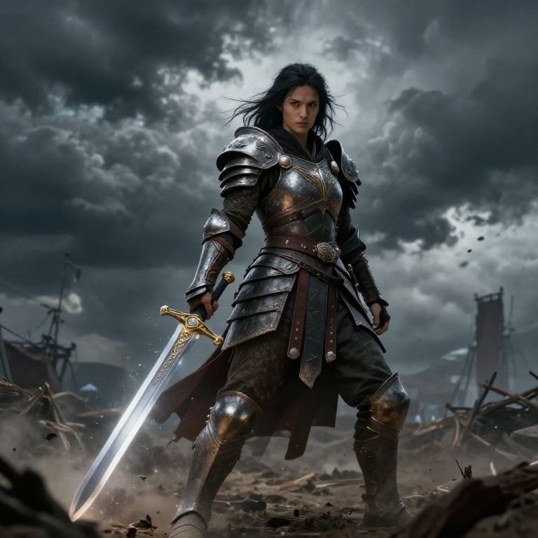 Tali, a warrior in ancient armor wielding a glowing sword, standing on a battlefield under a dramatic stormy sky, intense atmosphere, epic fantasy style, intricate detailing on armor and weapon.