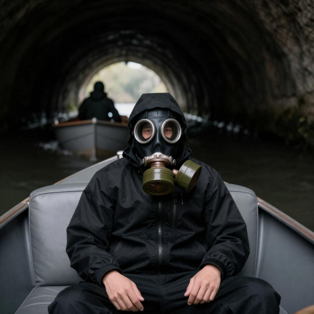 Three heavily armored men with gas masks in a dimly lit, narrow, brick-walled tunnel. One man in the center is grabbed by the collar by a man on the right. Blue light from the tunnel's end. Second man in the background watching. Intense expressions.