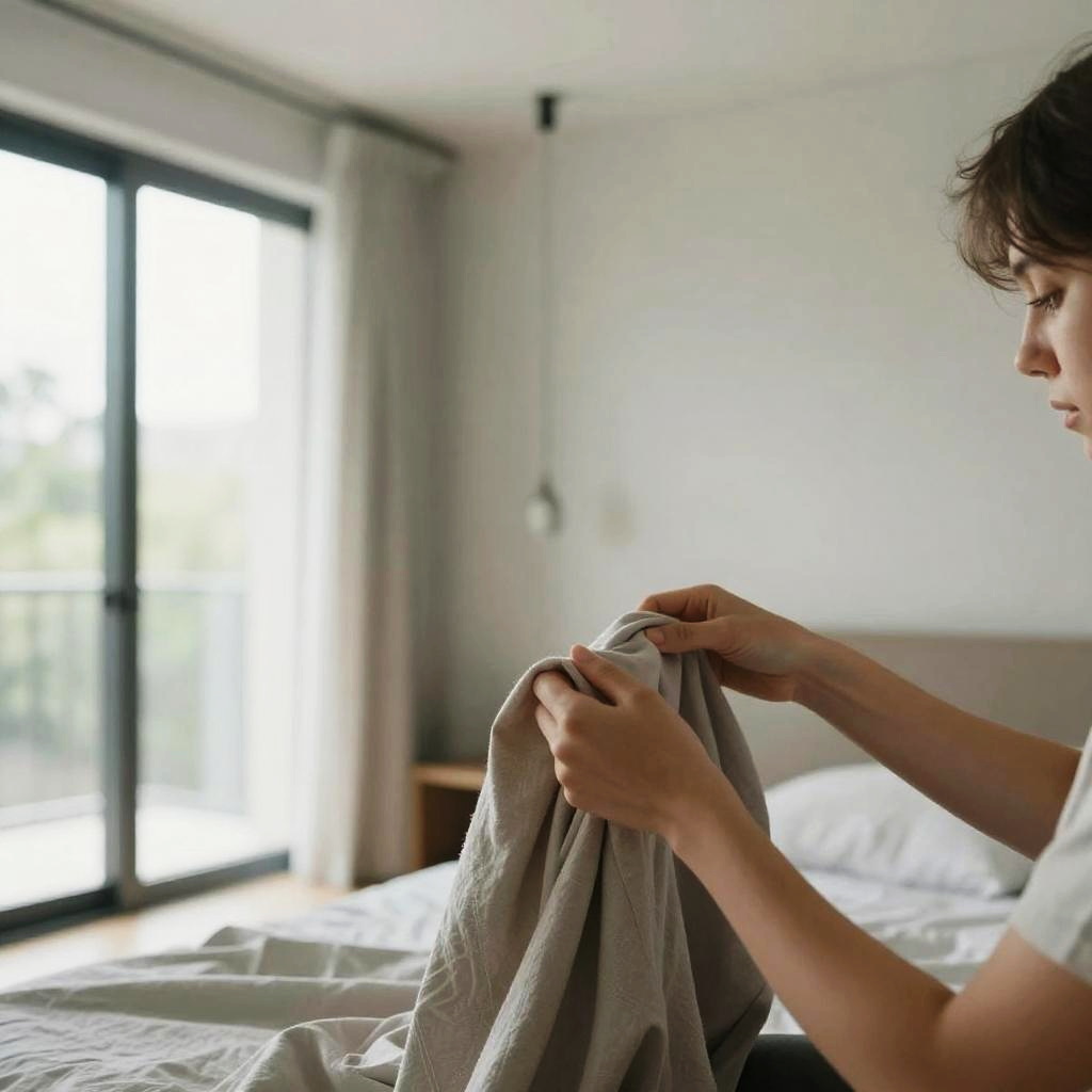 Removing clothes inside a modern minimalist bedroom, clean lines and muted color palette, natural daylight streaming through large windows, capturing the intimate, quiet moment with gentle fabric textures and soft skin tones, focusing on simplicity and calmness.