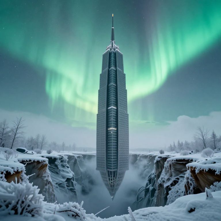 Emerging from a frosty chasm, a towering, skeletal skyscraper defies gravity as it hovers serenely against a backdrop of ethereal green auroras, creating a surreal vision of a world where architecture transcends the bounds of earthly constraints.