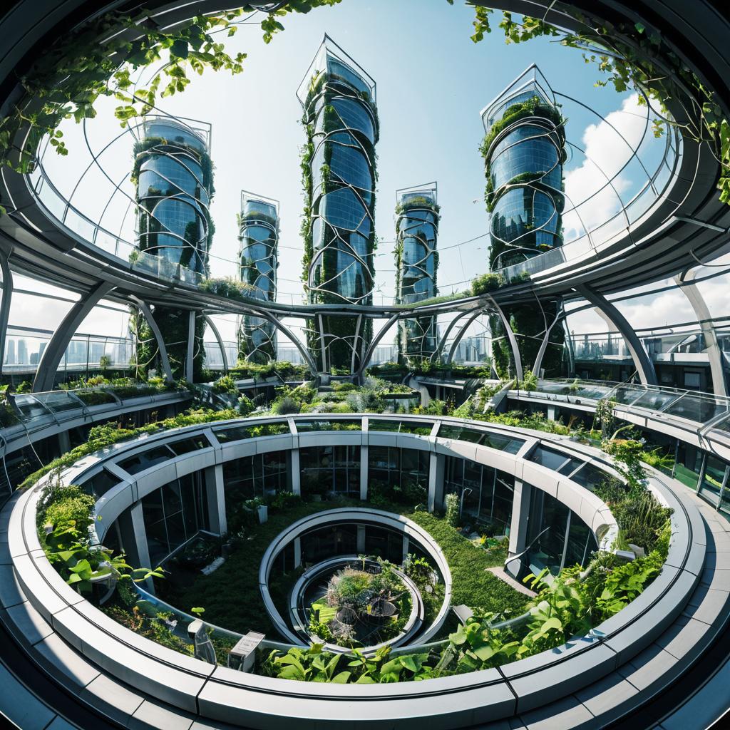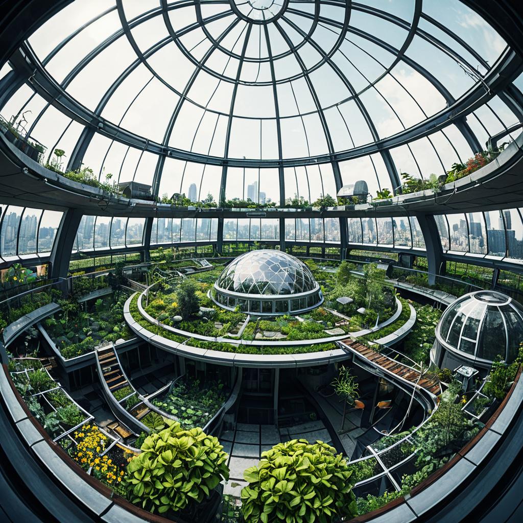 A photorealistic rooftop garden in a futuristic metropolis, featuring a biomechanical-inspired design with hybrid metal and plant structures. The panoramic image is shot with a fish-eye lens under soft daylight, showcasing ultra-detailed vertical gardens inside a glass-covered structure with abundant greenery and modern architecture.
