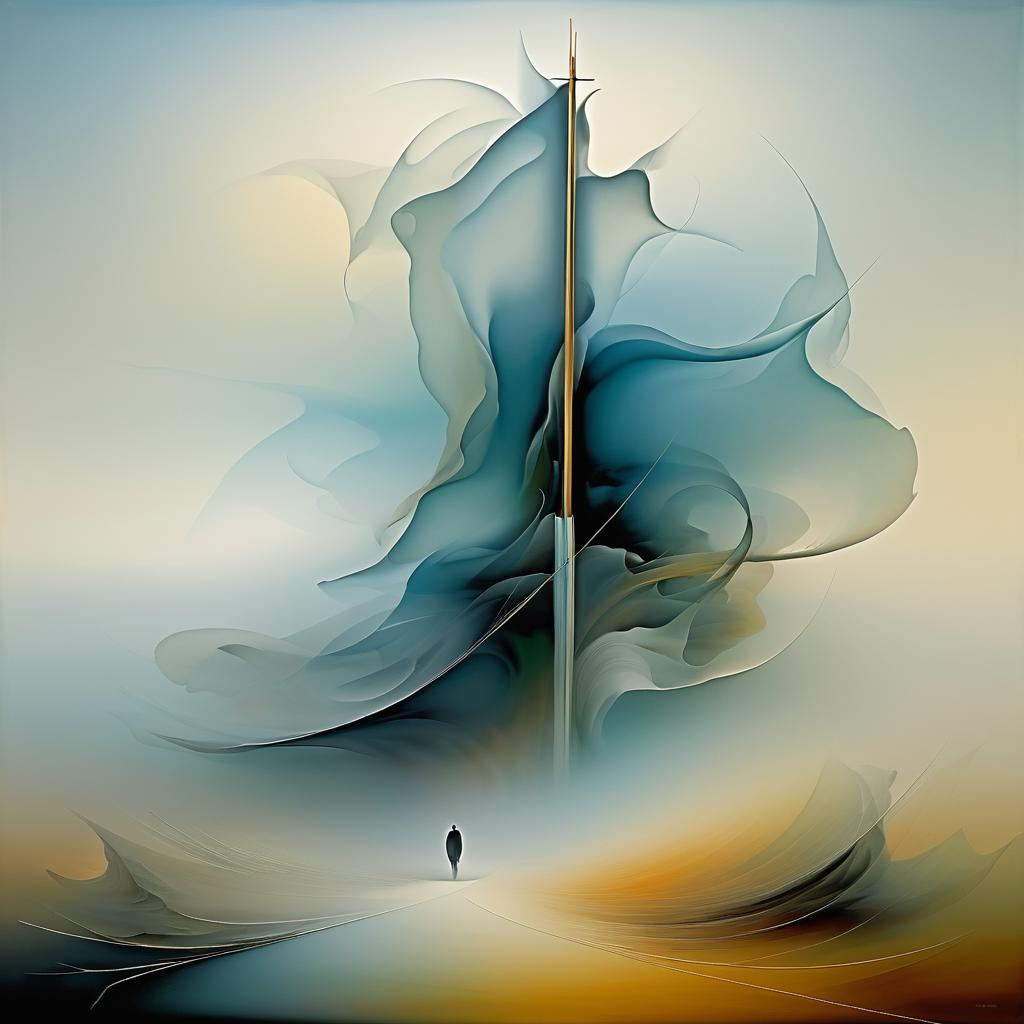 Abstract digital artwork symbolizing solitude using chaotic, flowing shapes and foggy textures. The image features a central symmetrical structure with translucent, sharp-edged curves in soft teal and beige tones, inspired by the surrealist style of Salvador Dalí.