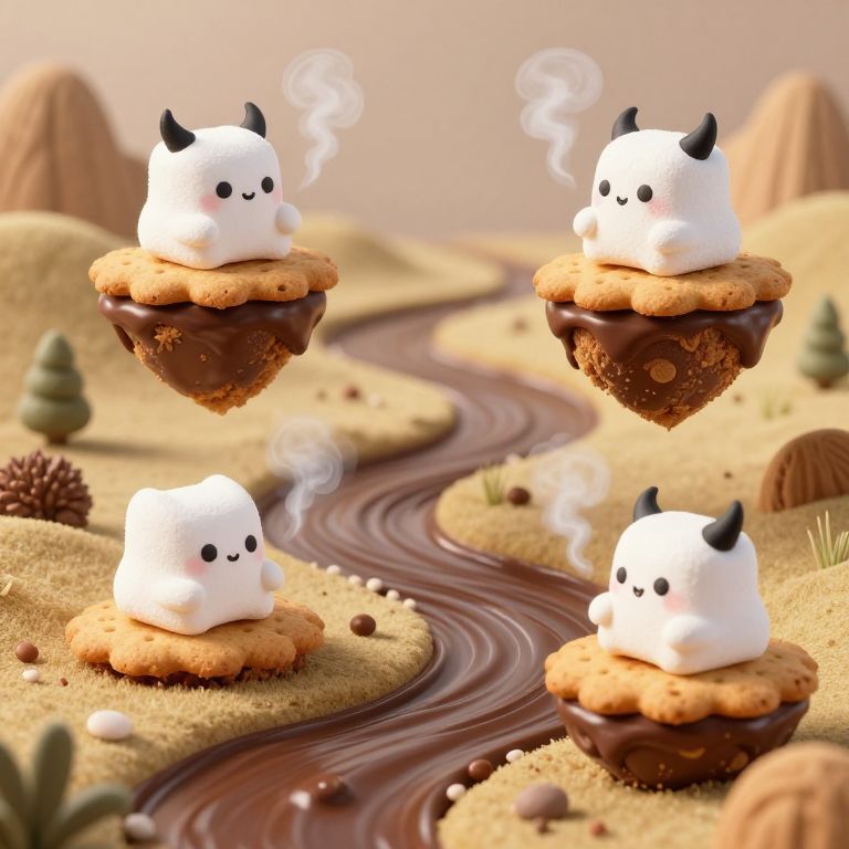 Chocolate rivers meander through a surreal landscape, nourishing three floating islands crafted from graham cracker crusts, each inhabited by marshmallow creatures adorned with black horns, conversing in wisps of steam.