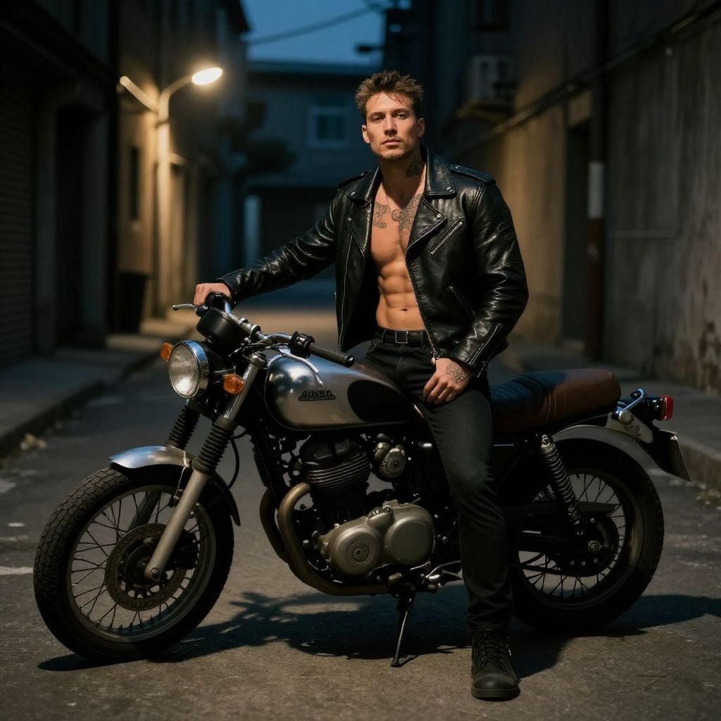 Short muscular guy posing with a vintage motorcycle in a deserted urban alley, leather jacket, tattoos visible, gritty textures, moody lighting with shadows and ambient streetlights