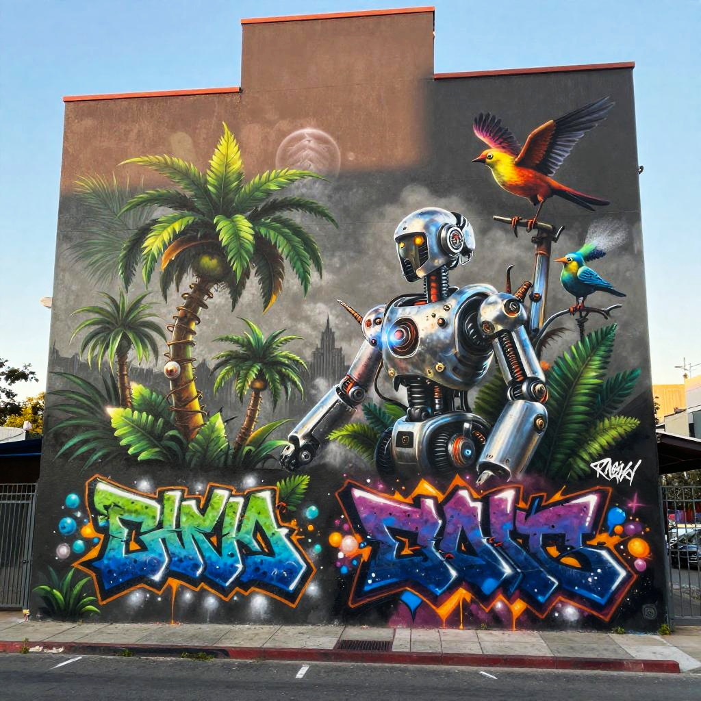 Grafitti generator designing urban-style murals combining nature and technology themes, vivid spray paint artwork illustrating robotic plants and birds on a large city wall, hyper-detailed textures, spray paint mist in golden hour light